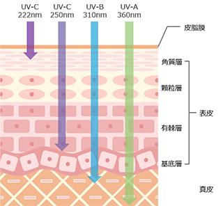 UV-Aは肌の黒化や光老化(しわ、たるみ)、UV-BやUV-C(一部波長以外)は、肌の炎症(日焼け)、シミや皮膚がんの原因にもなる。