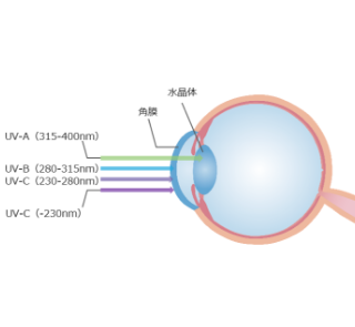 水晶体のタンパク質は紫外線を吸収すると酸化凝縮するため老人性白内障はUV-AやUV-Bの曝露が主原因といわれる。またUV-BやUV-C(一部波長以外)は急性角膜炎を引き起こす。