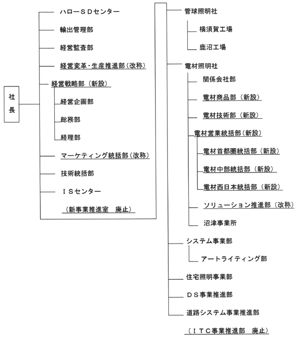 (5) 社内カンパニーの電材照明社に関し、商品力強化等を図るため、商品企画部門および技術部門を各々再編し、「電材商品部」および「電材技術部」を新設します。(これに伴い、施設・屋外照明部、電材機器部、EB推進部は廃止) また、商品領域の拡大に伴い、従来のライティング・ソリューション推進部を「ソリューション推進部」に改称します。