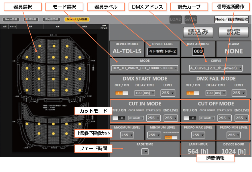 画面左側の劇場に配置したダウンライトをタッチして選択、情報を読み取り、画面右側で詳細機能設定、器具の状態を表示することができます。