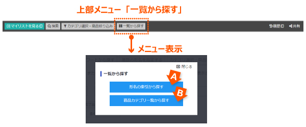 上部メニューの「一覧から探す」から、「形名の索引から探す」ページおよび「商品カテゴリ一覧から探す」ページが呼び出せます。それぞれの一覧から商品を絞り込むことができます。